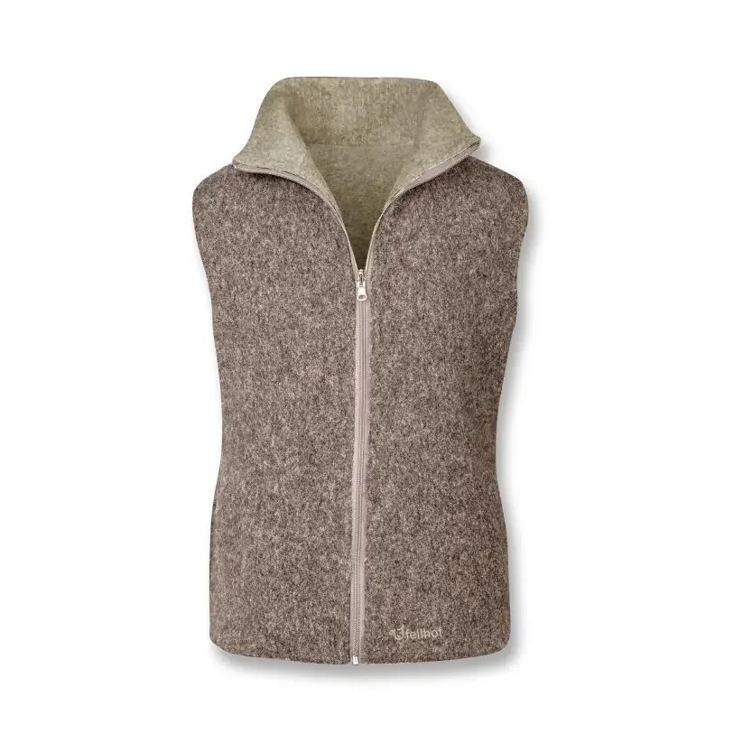 Westen sind zu jeder Jahreszeit ein patentes Kleidungsstück. Diese Wendeweste aus Woll-Filz ist beidseitig tragbar. Eine Seite ist hellgrau und die andere Seite ist dunkelgrau. Die robuste Jacke ist mit Stehkragen, Reißverschluss und zwei Eingriffstaschen je Trageseite ausgestattet – damit ist sie ein praktischer Begleiter im Alltag.