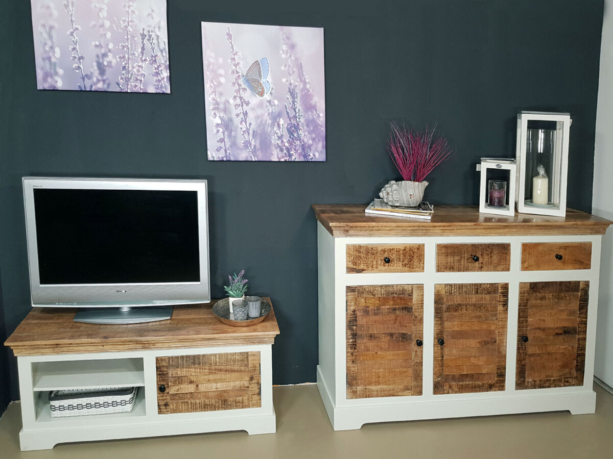 Lowboard aus recyceltem Mango-Altholz mit Säge- und