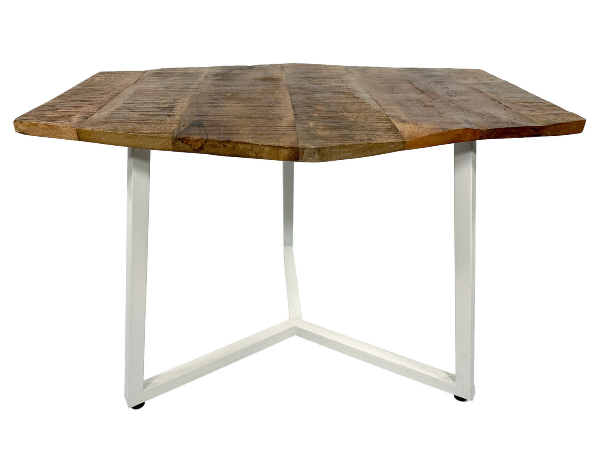 Der Couchtisch Lyon macht ein Wohnzimmer erst zu einer gemütlichen Wohlfühloase. Die Tischplatten unserer Couchtische werden nachhaltig aus recyceltem Mangoholz hergestellt und bieten genügend Platz für Ihr Fernsehzubehör, Knabbereien, Bücher, Zeitschriften und Telefon. Kleine Dekorationen lassen sich prima auf den Tischen positionieren. Die neue hippe Form des Couchtisches ist ganz frisch und modern. Dadurch wird dieser zu einem echten individuellen Highligt in Ihrem Wohnzimmer. Das Metallgestell aus weißem, altsilbernem oder schwarzem Metall bietet die nötige Standfestigkeit. D