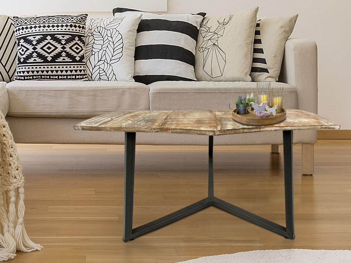 - Couchtisch nachhaltig aus recyceltem Altholz mit massivem Metall Gestell reinweiß, altsilber oder mattschwarz