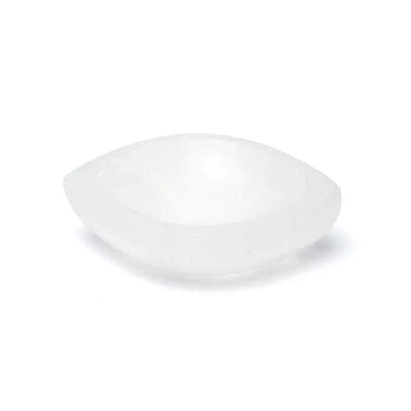 Eine glänzende Selenit-Schale in Augenform, ideal zur Aufbewahrung von Schmuck oder kleinen Dekorationsgegenständen.