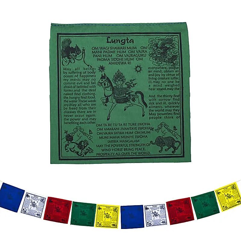 Lung-ta ist das Windpferd, das in der Mitte dieser Gebetsfahnen abgebildet ist (Lung bedeutet „Wind“ in der tibetischen Sprache). Auf seinem Rücken befindet sich das Symbol des wunscherfüllenden Juwels. Das Windpferd symbolisiert Glück, Reichtum und Wohlbefinden für Natur, Tiere, Menschen und die Gesellschaft als Ganzes.